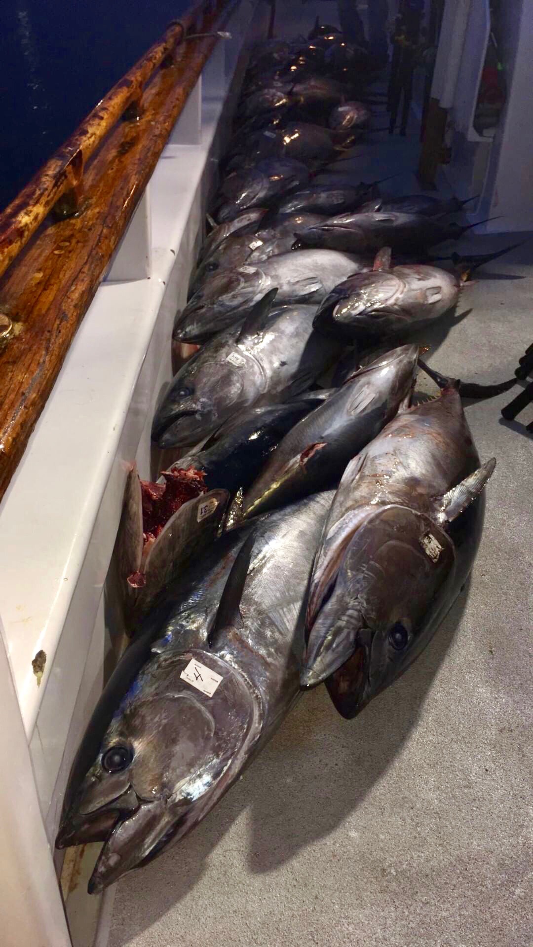 The bite continued and more 60-80 pound bluefin came over the rail as the light faded into our final night. While enjoying a few celebratory beers, a group of us gathered on the bow to cheer on fellow angler David Wilder. Who was well into an hour and a half plus fight with his 2nd bluefin of the trip. The crew pulled David’s well-earned fish onto the deck and it felt like the perfect way to wrap up our trip of limits style fishing on a trophy species. The Pacific Queen managed to put 44 Bluefin on boat!