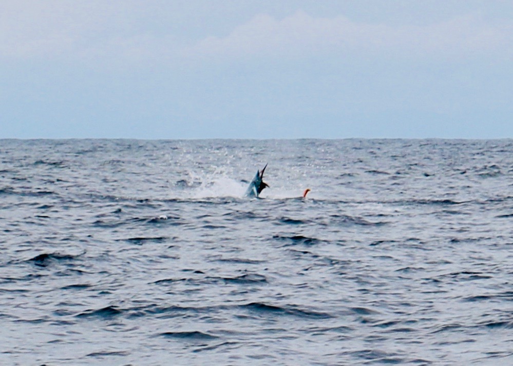We got our first glimpse of the very nice Striped Marlin on the line. I watched the fight through my camera lens as I attempted to snap pictures. The fish was certainly happy to provide plenty of photo ops with some magnificent jumps. Then as we began to steadily back down, the dreaded moment happen. Juan continuously reeled to stay tight but somehow the Striper came unbuttoned on its last jump.
