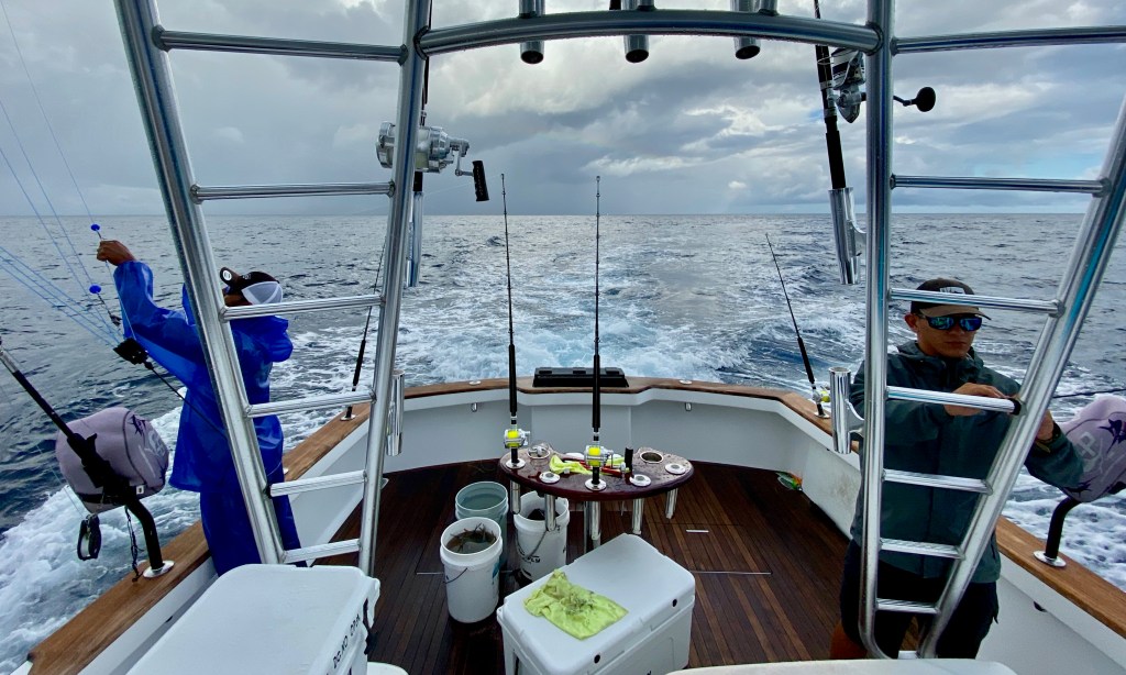 Eduardo rushed to the cabin to grab light spinning rods with ready to go sabiki rigs set up. We slid into a large piece of thick rope floating on the surface. Underneath lurked a massive bait ball that blacked out a spot in the water. 10-15 minutes later, we loaded the aft tuna tube well and the perfectly camoed teak in-deck live well with quality live bait.