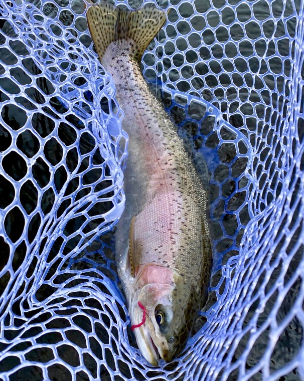 “That’s a nice one! Just keep the tip up and line tight while staying ahead of the fish. Start putting some pressure on him and swing him towards me…..” Tom instructed as he stretched out his net and scoped my first Rainbow Trout in the Sierra.